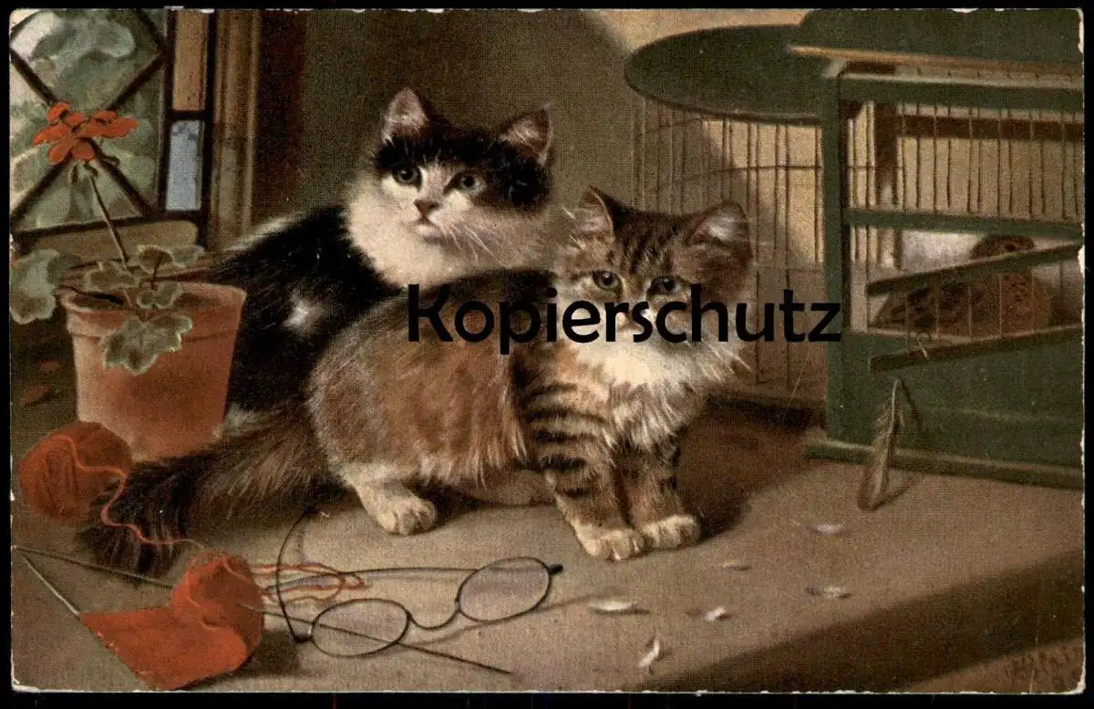 ALTE POSTKARTE KATZEN KATZE VOGELKÄFIG VOLGELFEDERN STRICKZEUG MARKE EGEMES cat cats chat chats postcard cpa AK