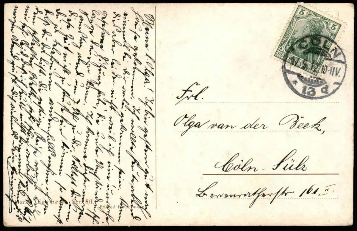 Gelaufen: 17.05.1912 mit Stempel Cöln nach Cöln-Sülz