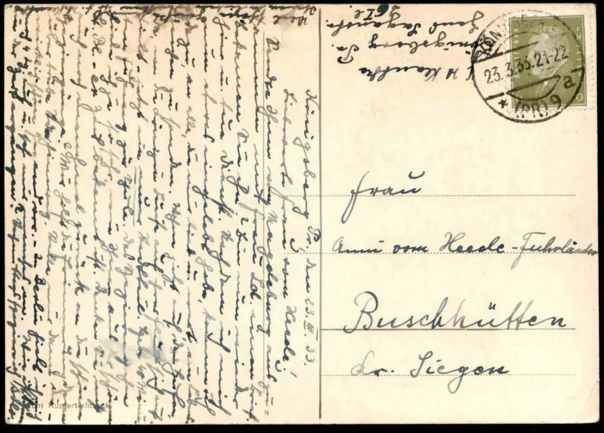 Gelaufen: 23.03.1933 mit Stempel Königsberg nach Buschhütten Kreis Siegen