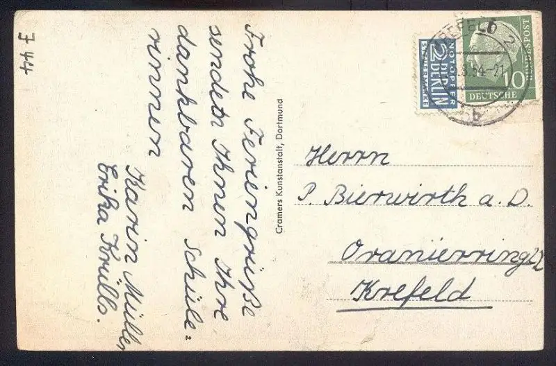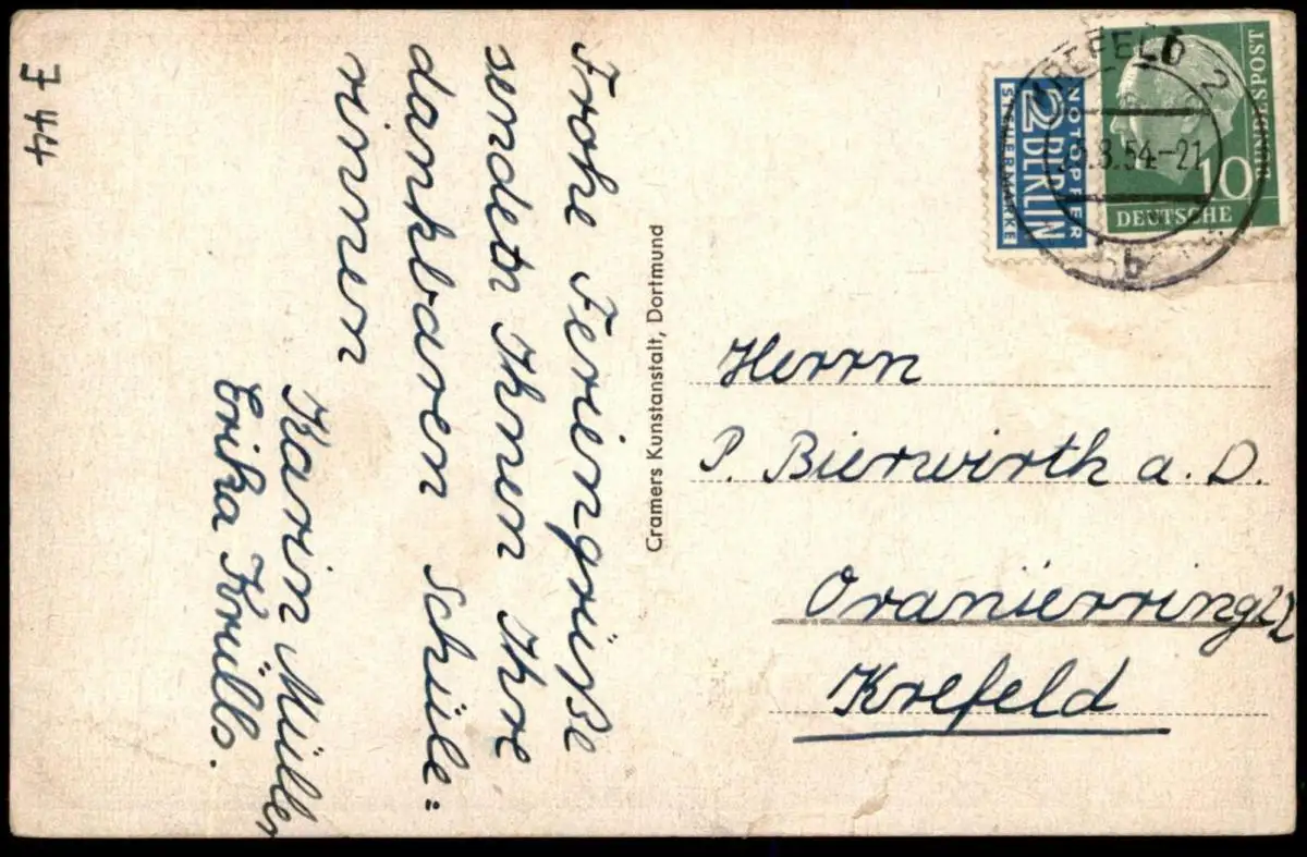 Gelaufen: 25.03.1954 mit Stempel Krefeld 2 an Rektor Paul Bierwirth in Krefeld