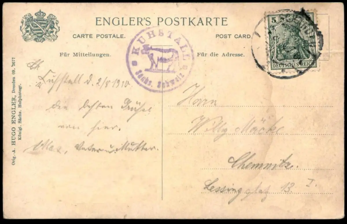 Gelaufen: 02.08.1910 mit Stempel Schandau nach Chemnitz