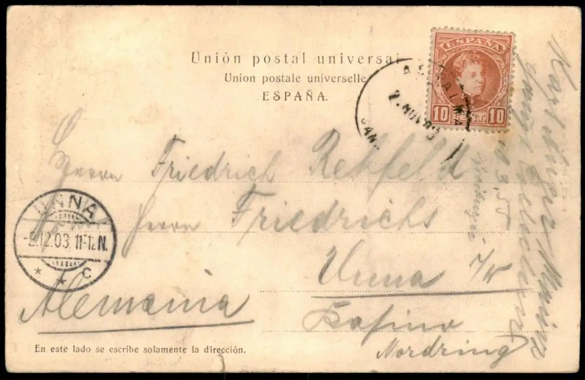 Gelaufen: 21.11.1903 mit Stempel Las Palmas nach Unna, Ankunftsstempel 02.12.1903