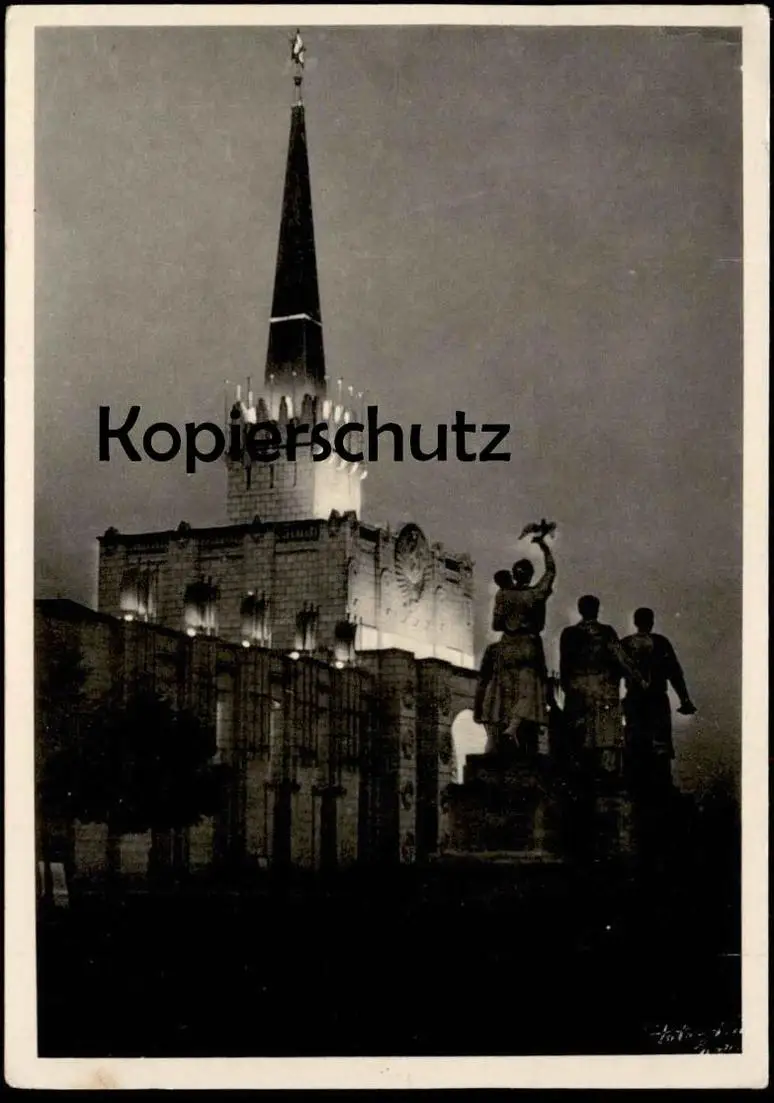 ALTE POSTKARTE LEIPZIG BEI NACHT ERSTRAHLT DAS MESSEGELÄNDE IM GLANZE FESTLICHER BELEUCHTUNG HIER DIE HALLE DER SOWJETUNION 1952Verlag: Volkskunstverlag Reichenbach i. V., Herausgeber Leipziger Messeamt