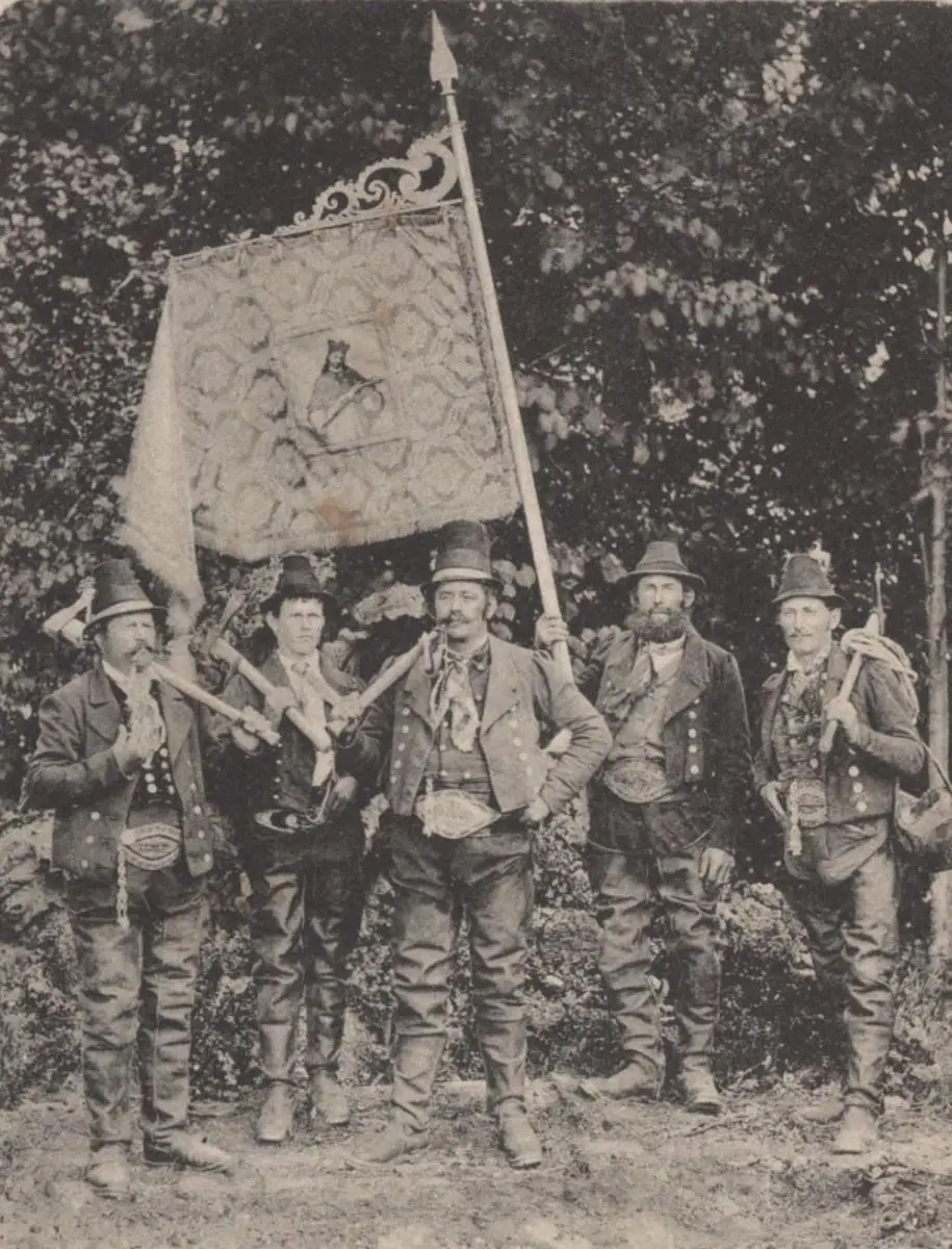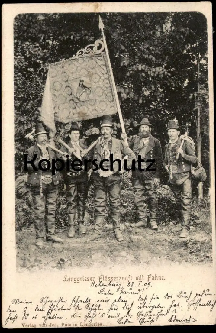 ALTE POSTKARTE LENGGRIESER FLÖSSERZUNFT MIT FAHNE Flösser Lenggries AK cpa postcard Ansichtskarte
