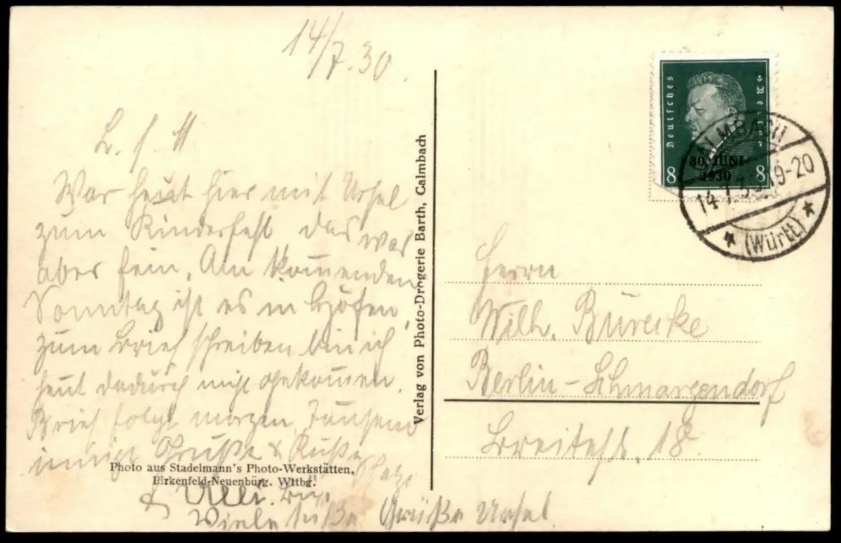 Gelaufen: 14.07.1930 mit Stempel Calmbach nach Berlin-Schwarzendorf