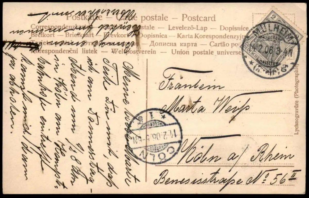 Gelaufen: 14.02.1906 mit Stempel Mülheim am Rhein nach Köln