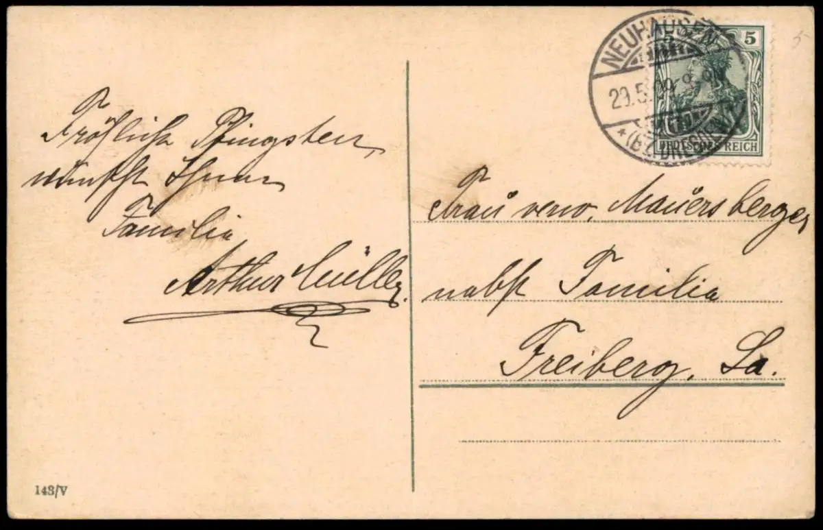 Gelaufen: 29.05.1909 mit Stempel Neuhausen Bezirk Dresden nach Freiberg