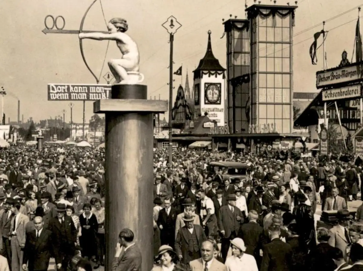 ALTE POSTKARTE MÜNCHEN GRUSS VOM OKTOBERFEST 1936 WIESN PSCHORR Ochsenbraterei WC Toilette toilet Ansichtskarte postcard