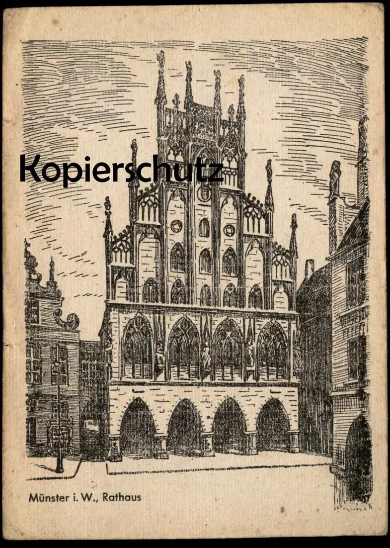 ALTE POSTKARTE MÜNSTER WESTFALEN RATHAUS STEINZEICHNUNG RADIERUNG PAPIER VERM. ZU KRIEGSZEIT postcard Ansichtskarte cpa