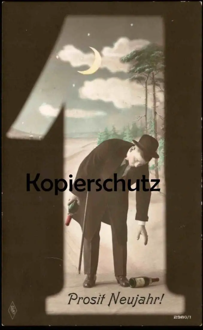 ALTE POSTKARTE PROSIT NEUJAHR MANN & SEKT ALKOHOL MONDVerlag: PFB