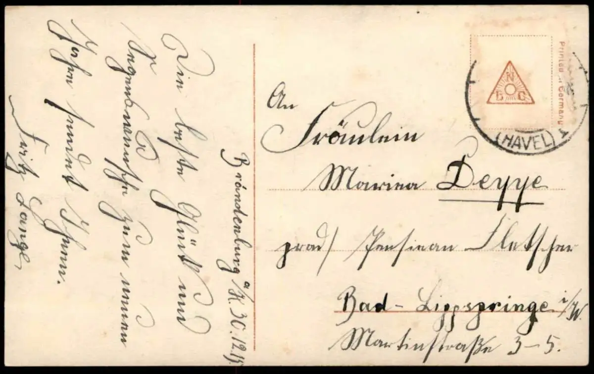 Gelaufen: 30.12.1915 von Brandenburg Havel nach Bad Lippspringe, Briefmarke (sauber) entfernt