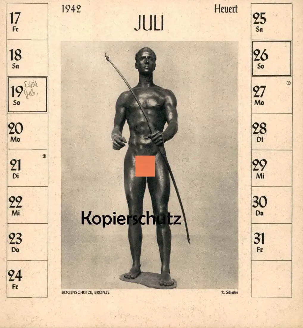 ALTE POSTKARTE RICHARD SCHEIBE BOGENSCHÜTZE JULI 1942 DEUTSCHE PLASTIK MÄNNERAKT