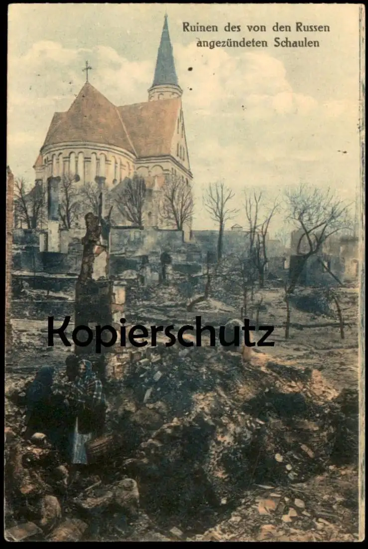 ALTE POSTKARTE RUINEN DES VON RUSSEN ANGEZÜNDETEN SCHAULEN SIAULIAI