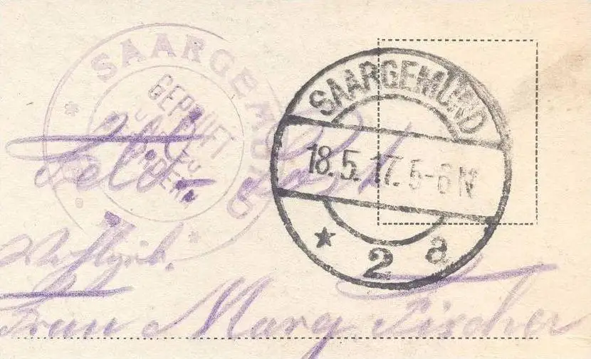 Gelaufen: 18.05.1917 mit Poststempel sowie Stempel "SAARGEMÜND GEPRÜFT UND ZU BEFÖRDERN"