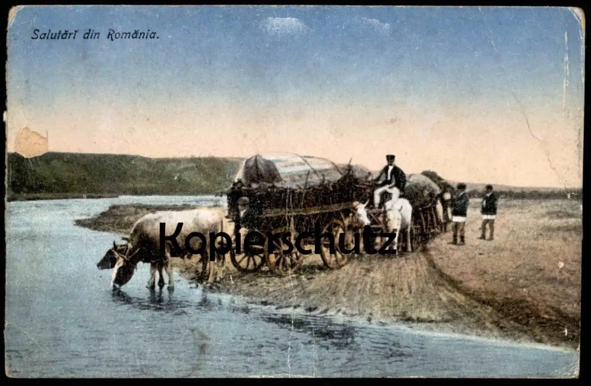 ALTE POSTKARTE SALUTARI DIN ROMANIA Landwirte Farmer Kuh Treck cow vache Rumänien roumanie Ansichtskarte AK cpa postcard