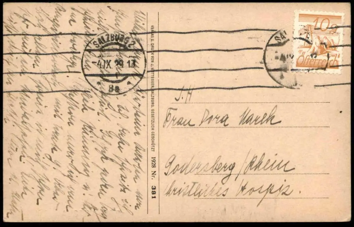 Gelaufen: 04.09.1929 mit Stempel Salzburg 2 nach Godesberg Rhein, Christliches Hospiz