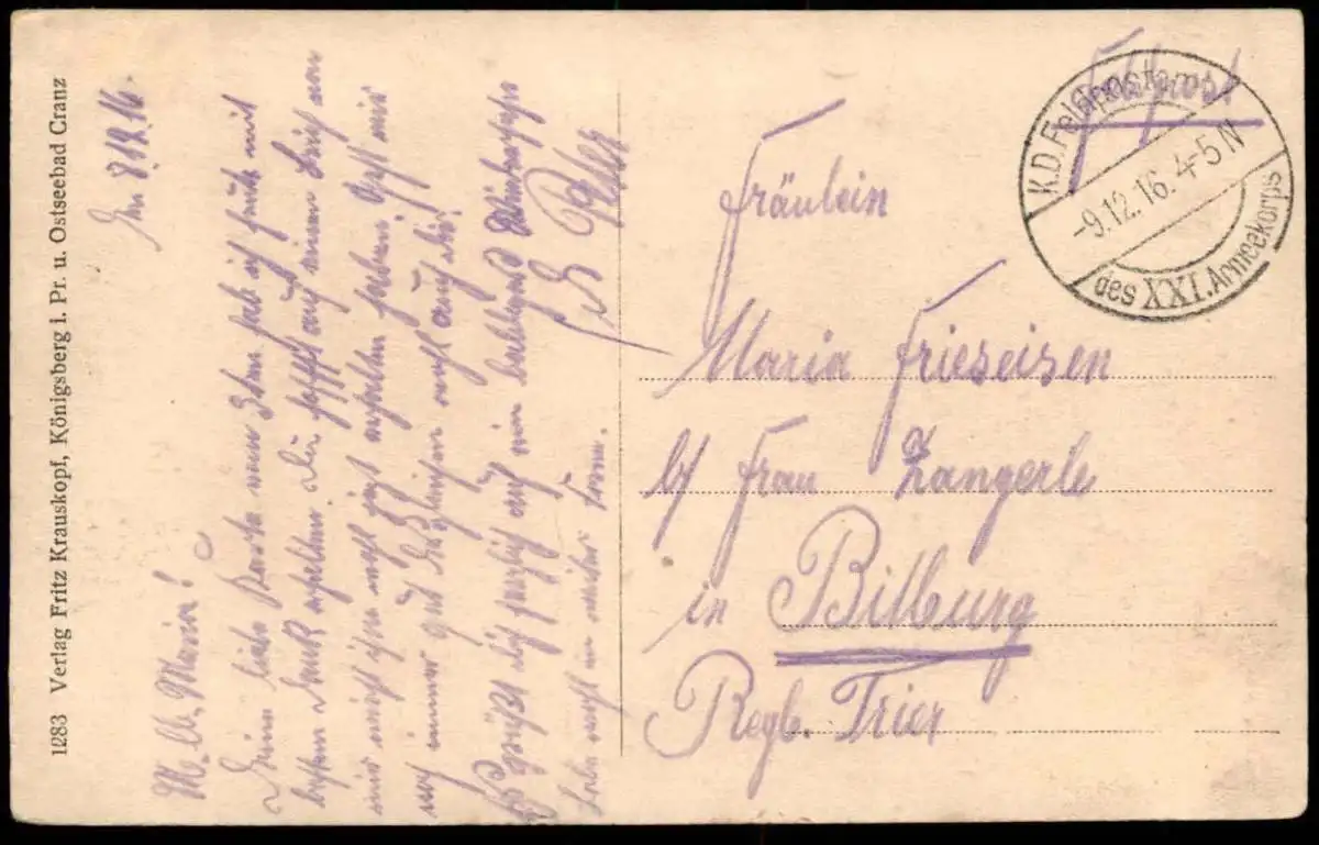 Gelaufen: 09.12.1916 nach Bitburg Bezirk Trier