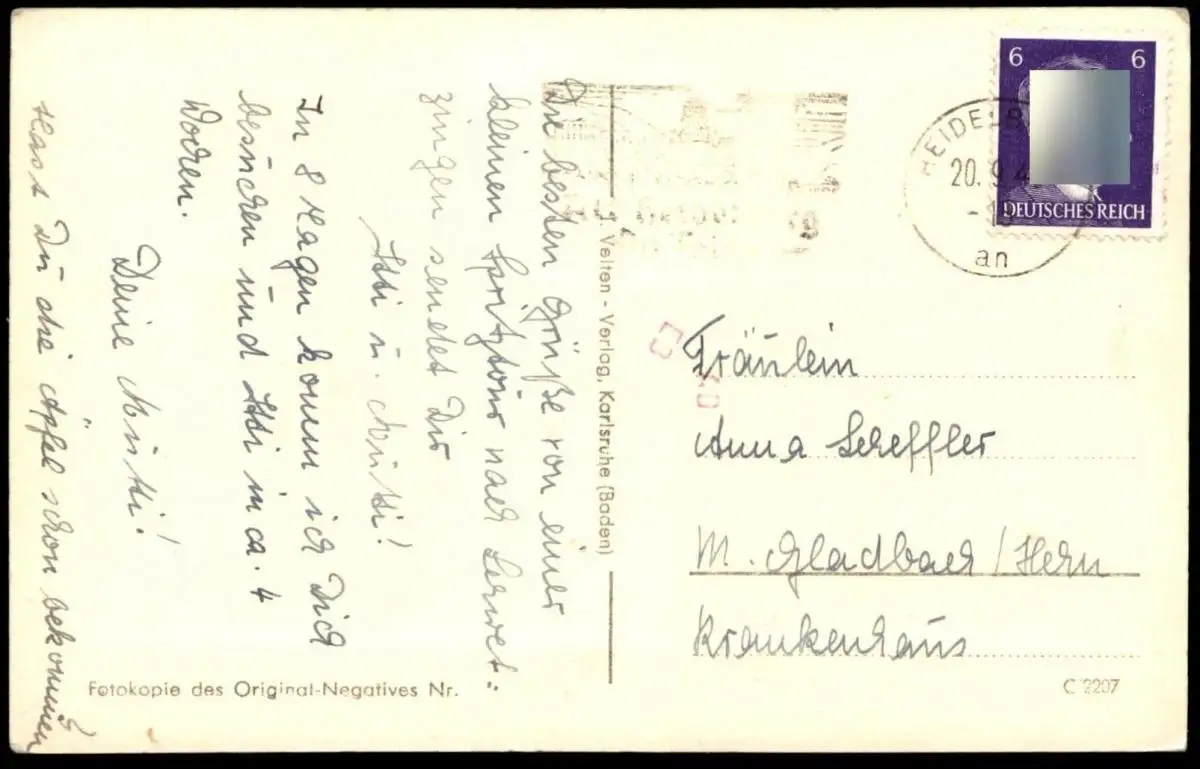 Gelaufen: 20.09.1943 mit Stempel Heidelberg nach Mönchengladbach KrankenhausErhaltung (s. Scan): gut / 915288