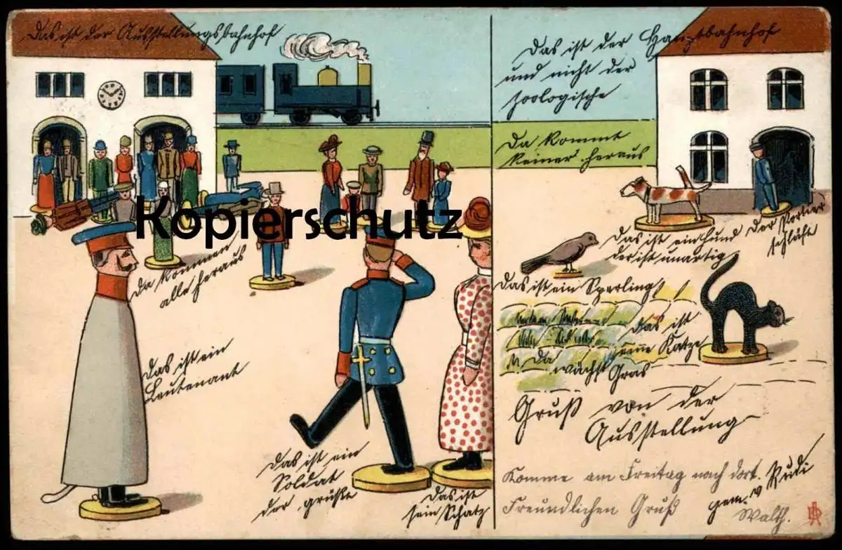 ALTE POSTKARTE SOLDAT SPIELZEUG DAS IST DER HAUPTBAHNHOF UND NICHT DER ZOOLOGISCHE BAHNHOF, BDA KOMMT KEINER HERAUS, DAS IST EIN SPERLING, DAS IST EIN HUND DER IST UNARTIG, DER PORTIER SCHLÄFT, DAS IST EIN SOLDAT DER GRÖSSTE, DAS IST SEIN SCHATZ, DAS IST EIN LEUTNANT, DAS IST DER AUSSTELLUNGSBAHNHOF, DIE KOMMEN ALLES RAUS, Verlag: unbekannt