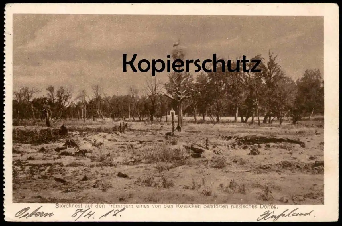 ALTE POSTKARTE STORCHNEST AUF DEN TRÜMMERN EINES VON KOSAKEN ZERSTÖRTEN DORFES RUSSLAND torchennest Storch stork's nest
