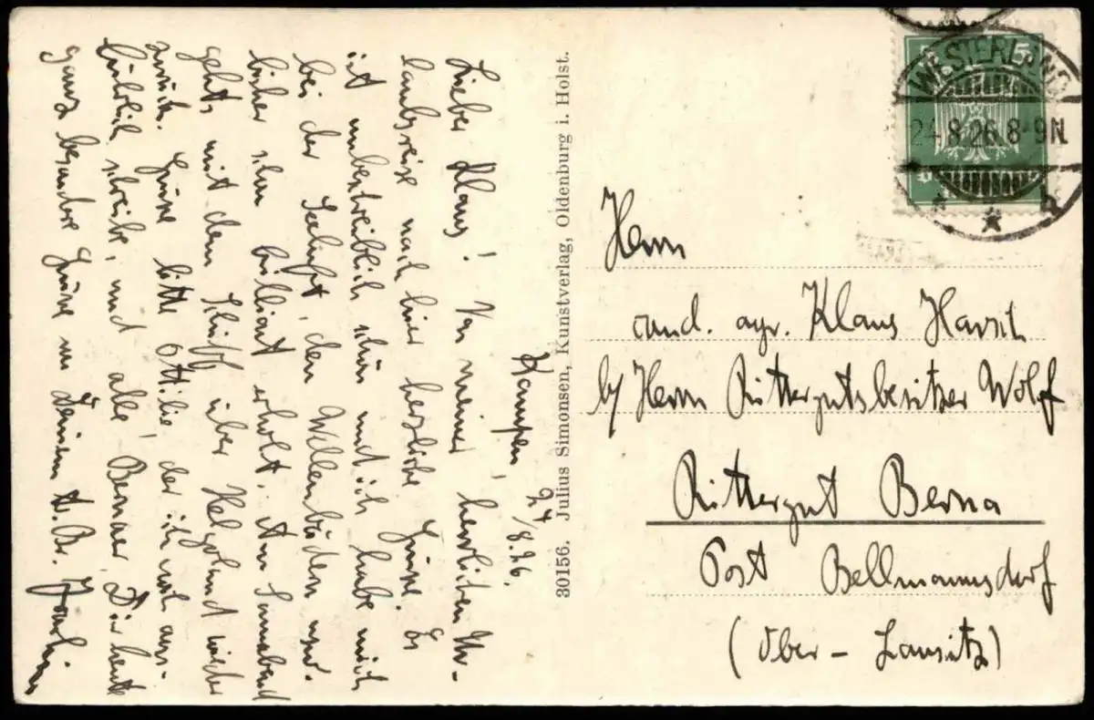 Gelaufen: 24.08.1926 mit Stempel Westerland nach Rittergut Berna Post Bellmannsdorf Ober-Lausitz