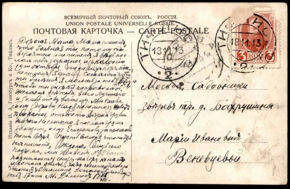 Gelaufen: 18.11.1913 mit Stempel Tiflis, Briefmarke zu kleinem Teil entfernt
