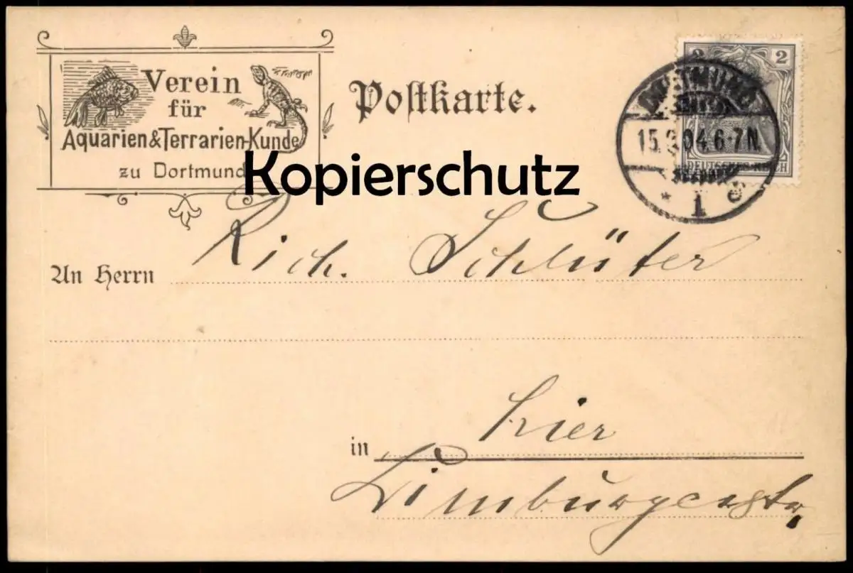 ALTE POSTKARTE VEREIN FÜR AQUARIEN- UND TERRARIENKUNDE ZU DORTMUND TAGESORDNUNG SITZUNG AM FREITAG 17.06.1904: 1. VORTRAG DES HERRN LIPAVSKY UNSERE EINHEIMISCHEN TIERFANGENDEN SUMPF- UND WASSERPFLANZEN, 2. BESPRECHUNG DER ZEITSCHRIFTEN, 3. EXKURSIONSBERICHTE; 4. EINBRINGUNG FREMDER PFLANZEN IN HIESIGE FLORA; AUSTAUSCH VON WASSERPFLANZEN Verlag: unbekannt