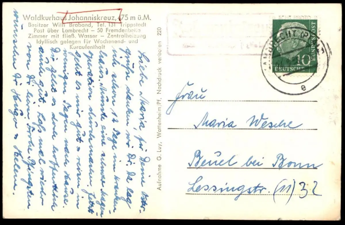 ALTE POSTKARTE WALDKURHAUS JOHANNISKREUZ TRIPPSTADT POST ÜBER LAMBRECHT BESITZER WILLI BRABAND