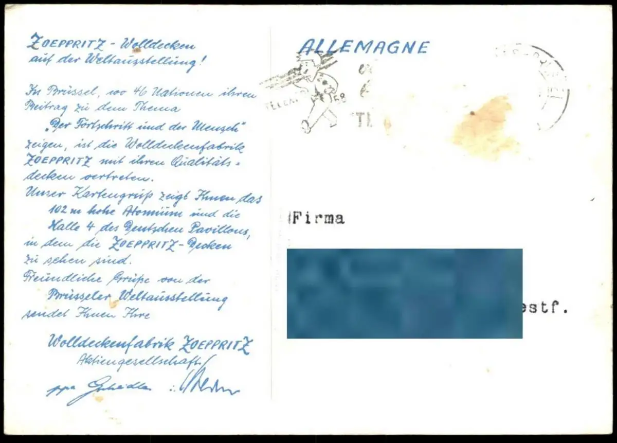 ALTE POSTKARTE ZOEPPRITZ WOLLDECKEN AUF DER WELTAUSSTELLUNG BRÜSSEL ATOMIUM HEIDENHEIM MERGELSTETTEN Ansichtskarte cpa