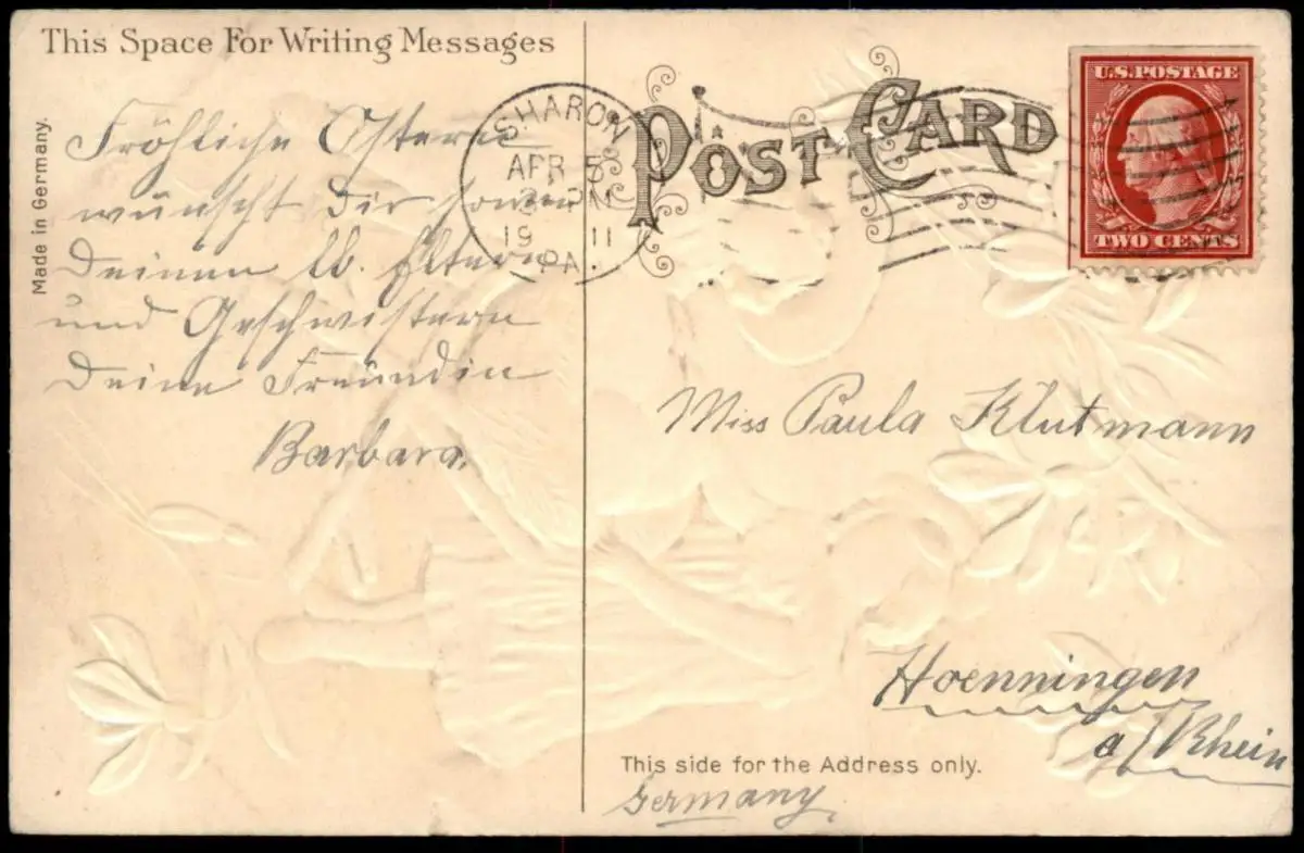Gelaufen: 05.04.1911 mit Stempel Sharon USA nach (Bad) Hönningen