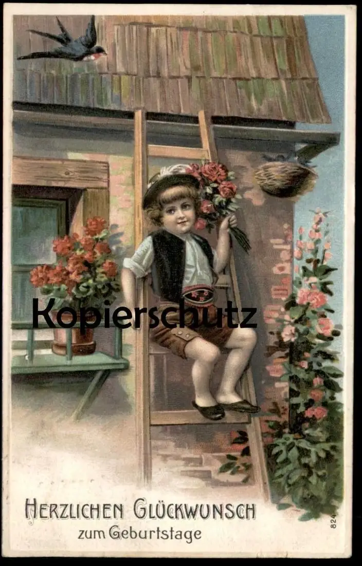 ALTE PRÄGE POSTKARTE HERZLICHEN GLÜCKWUNSCH ZUM GEBURTSTAG JUNGE AUF EINER LEITER MIT VOGELNEST KIND Nest nid boy bird