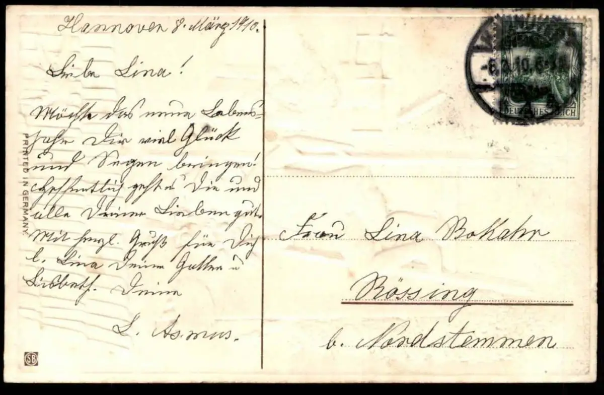 Gelaufen: 08.03.1910 mit Stempel Hannover nach Rössing bei Nordstemmen