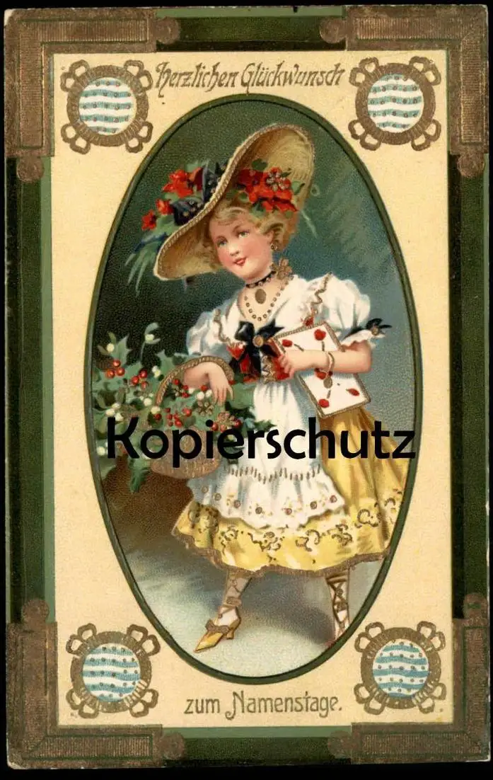 ALTE PRÄGE POSTKARTE HERZLICHEN GLÜCKWUNSCH ZUM NAMENSTAGE MÄDCHEN MIT HUT VERGOLDET ILEX Namenstag AK cpa postcard