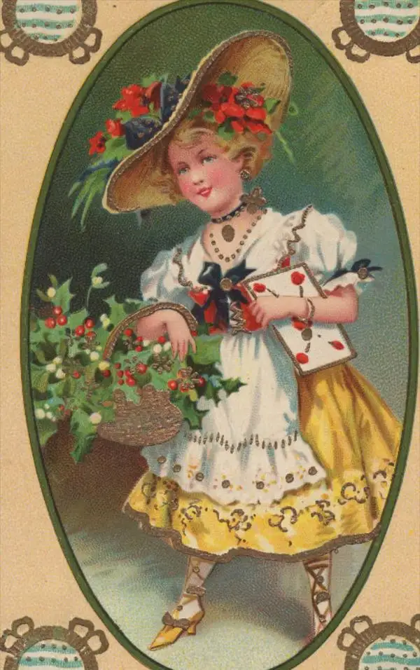 ALTE PRÄGE POSTKARTE HERZLICHEN GLÜCKWUNSCH ZUM NAMENSTAGE MÄDCHEN MIT ILEX UND HUTVerlag: A B Gold Desssin 6