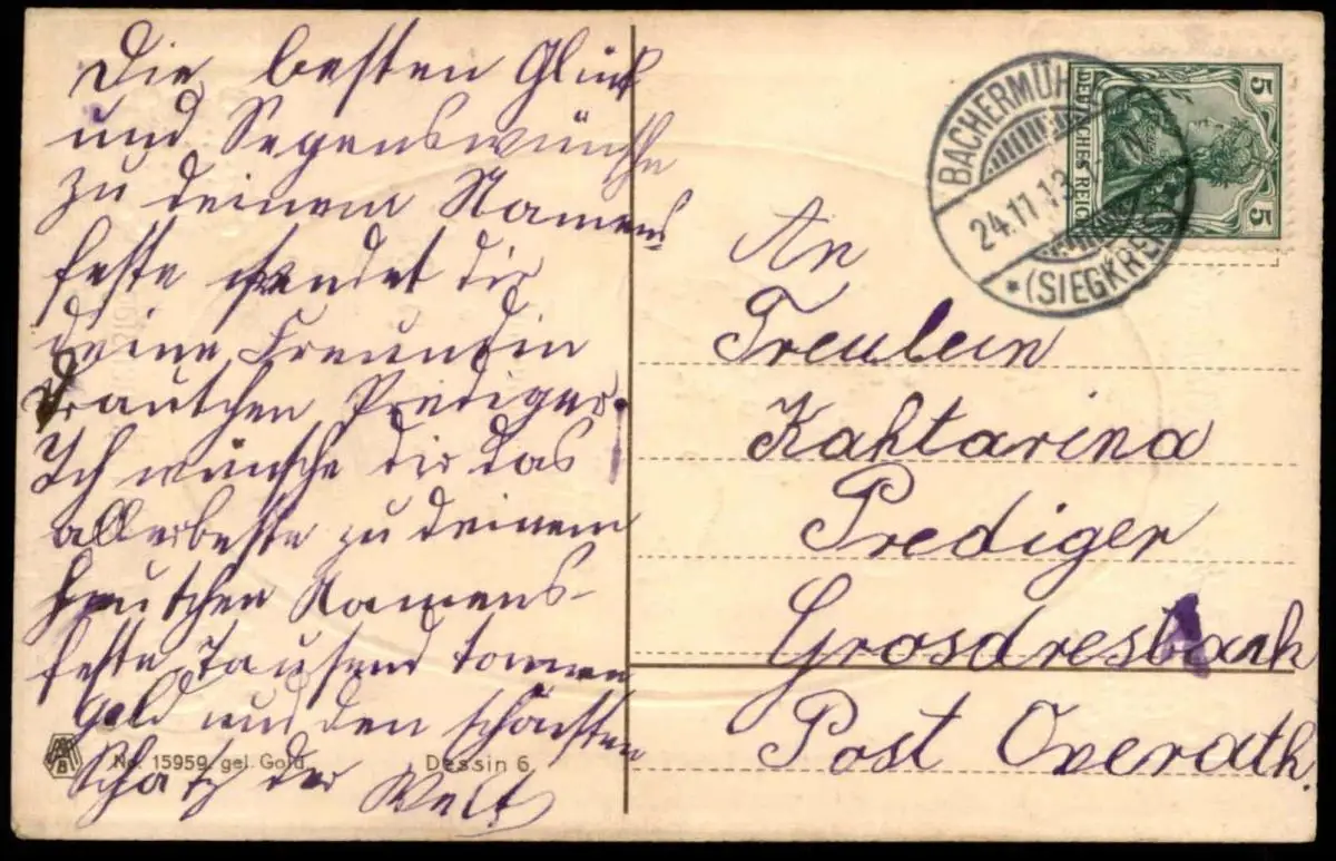 Gelaufen: 24.11.1913 mit Stempel Bachermühle Siegkreis nach Grossdresbach Post Overath
