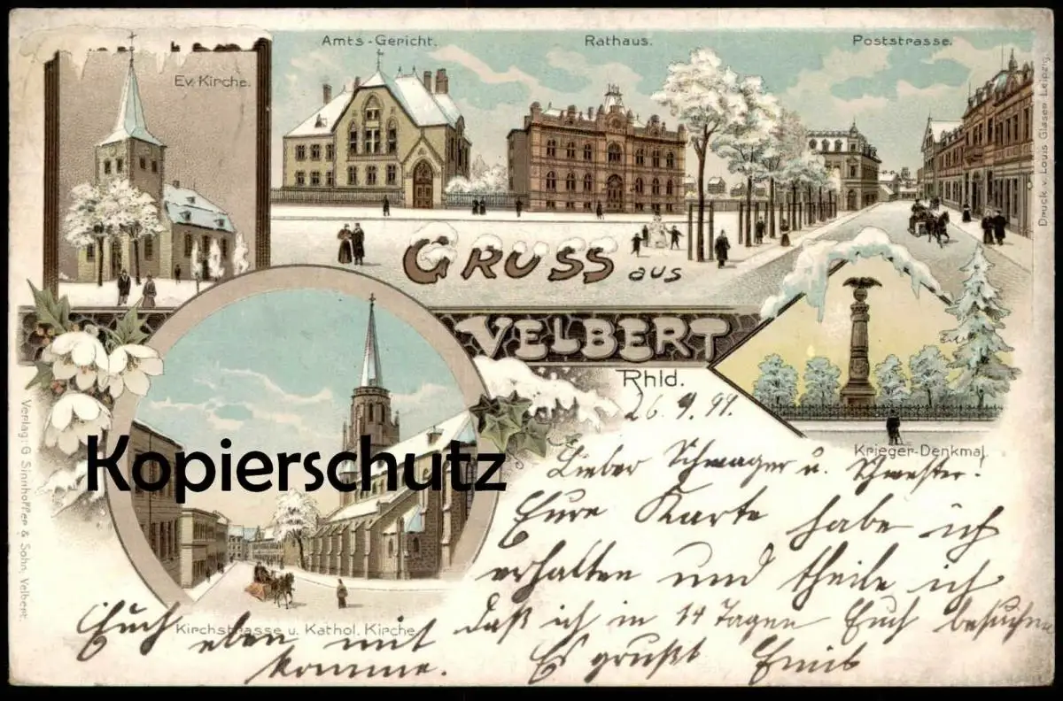 ALTE WINTER LITHO POSTKARTE GRUSS AUS VELBERT KIRCHSTRASSE KATH. KIRCHE EV. KIRCHE AMTS-GERICHT RATHAUS POSTSTRASSE KRIEGER-DENKMAL