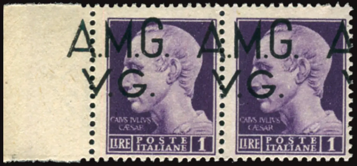 AMG. Sehr guter Zustand. - Lesen Sie 1 Paar verschobene Überdrucksorten Vollgummi MNH - AMG. Sehr guter Zustand. - Lire 1 n. 8hb horizontales Paar mit stark nach links verschobenem Aufdruck, das erste Randexemplar mit dem M.G. A und A auch am linken Blattrand wiederholt - Seltene Sorte gepaart mit der Nr. 8hh - Kat. euro 800++ Cod. 940/16