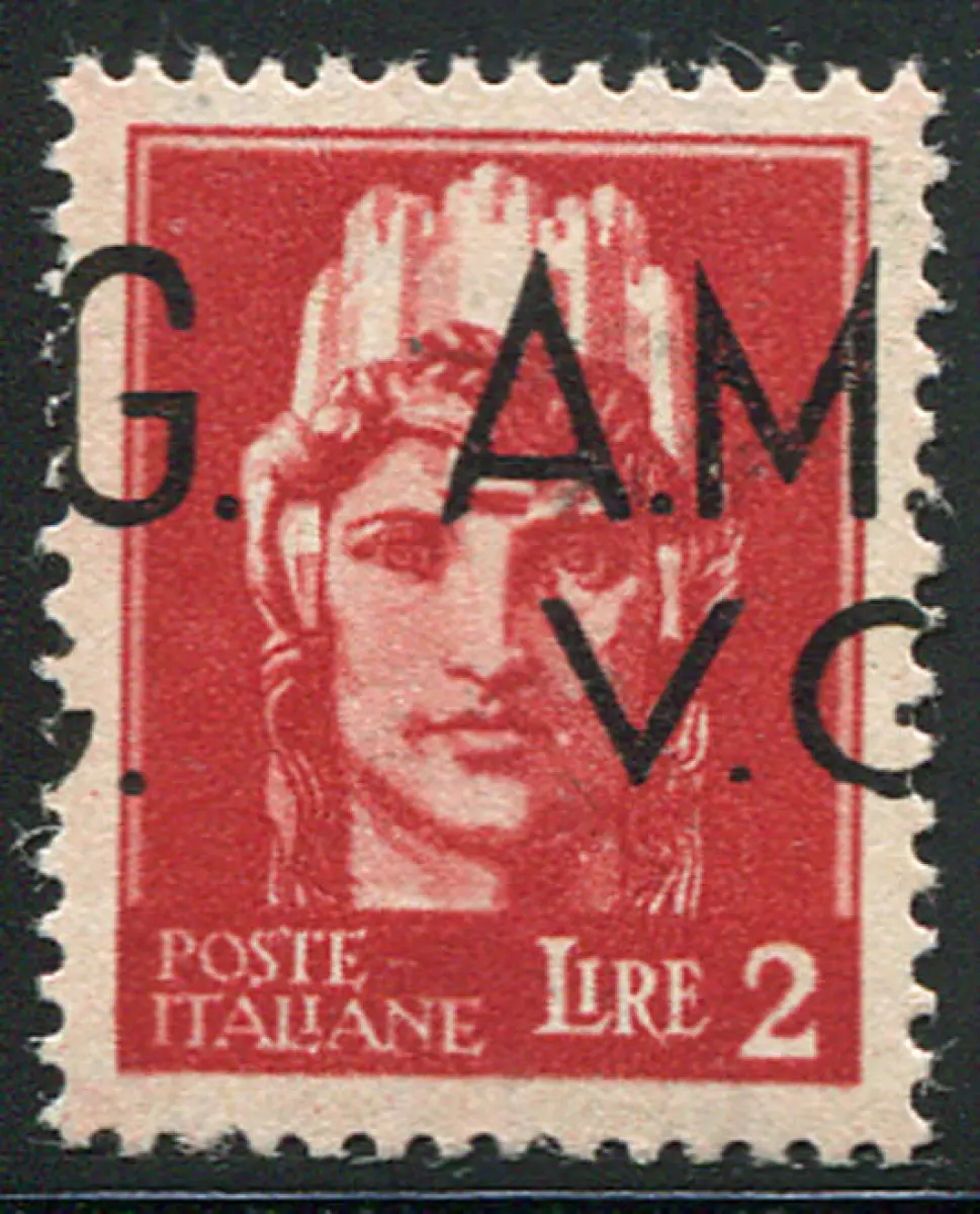 Vollgummi - AMG. Sehr guter Zustand. - Lire 2 n. 9hl stark nach rechts verschobener Aufdruck G.A.M. - Ungewöhnlicher Code 761/11