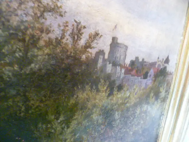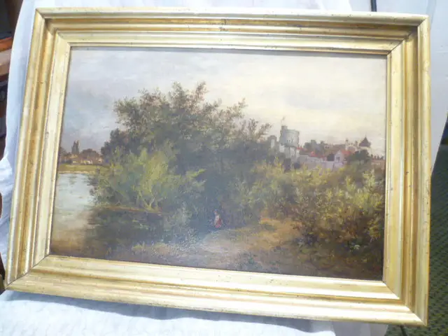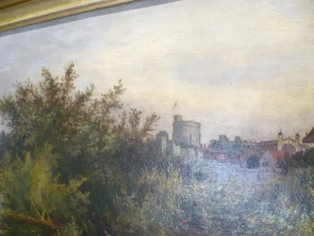 Genregemälde mit einem Angler an der Themse mit Sicht nach link auf die Stadt Windsor und nach rechts auf das Schloss Windsor,wohl an einem klaren Herbstag gemalt.