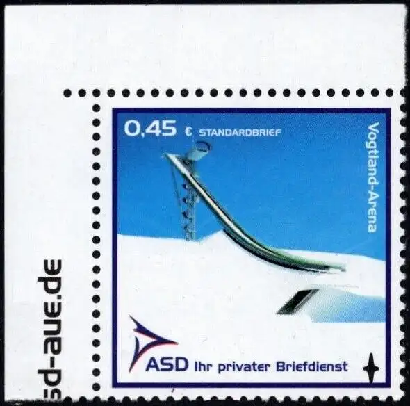 • MichSeite ASD: MiNr. 24, 27.04.2006, "Vogtland-Arena", Satz, Eckrandstück, postfrisch Beschreibung \nPostdienstleister: ASD, Aue \nAusgabeanlass: Briefmarkenausgabe "Vogtland-Arena" Katalognummer: MiNr. 24 Ausgabedatum: 27.04.2006 Nominale: Satz (1 Wert) zu 0,45 EUR \nTyp: - \nErhaltung: nassklebend, gezähnt, postfrisch \nHinweis: Eckrandstück, mit Sicherheitsmerkmal (Ornamentstanzung im Markenbild unten rechts) Thema: Sport, Skisprunganlage, Sachsen, Klingenthal, Schwarzberg