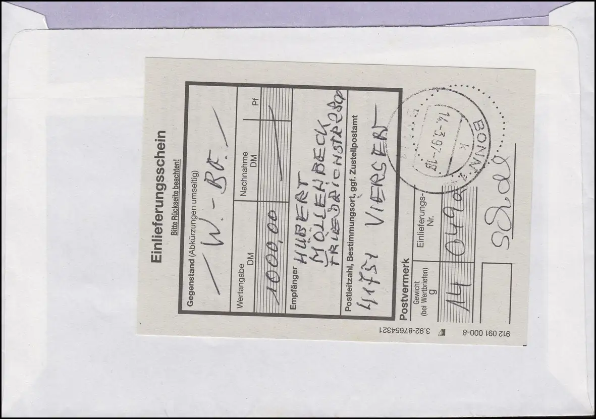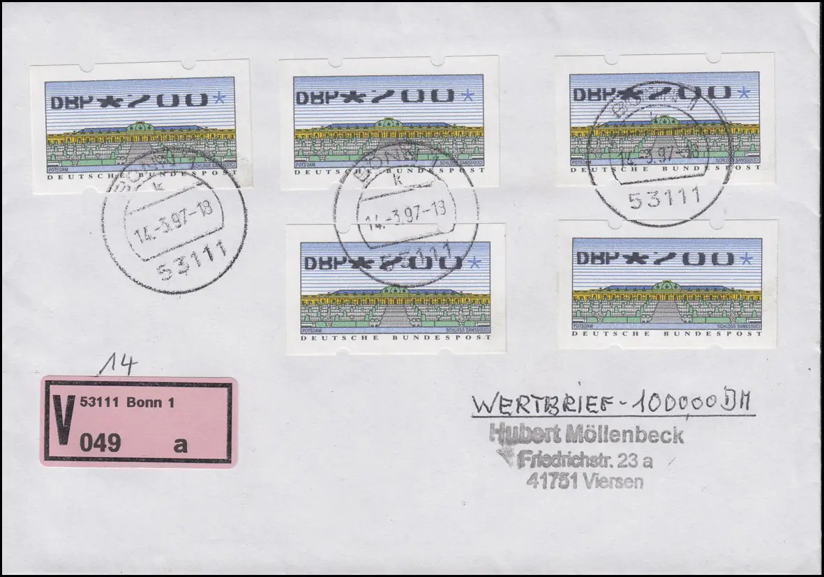 ATM 2.2.1X Sanssouci 5 fois 200 Pf avec impression partielle sur la lettre de valeur Bonn 14.3.97