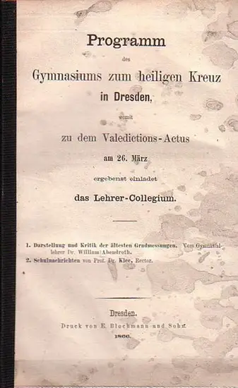 Abendroth, William / Klee, Prof. Dr: Programm des Gymnasiums zum heiligen Kreuz in Dresden womit zu dem Valedictions-Actus am 26. März ergebenst einladet das Lehrer-Collegium. 1. Darstellung und Kritik der ältesten Gradmessungen von Gymnasiallehrer Dr.W.