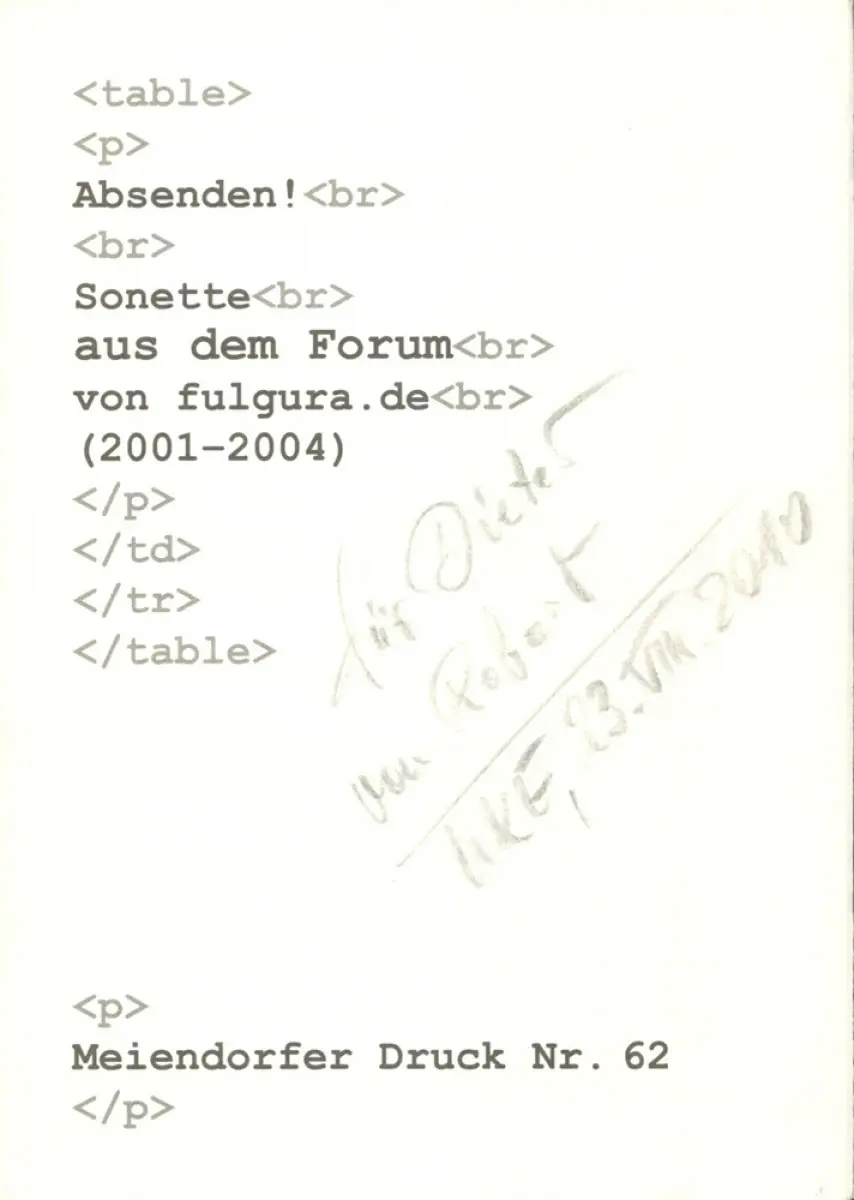 Absenden!. Sonette aus dem Forum von fulgura.de (2001-2004).