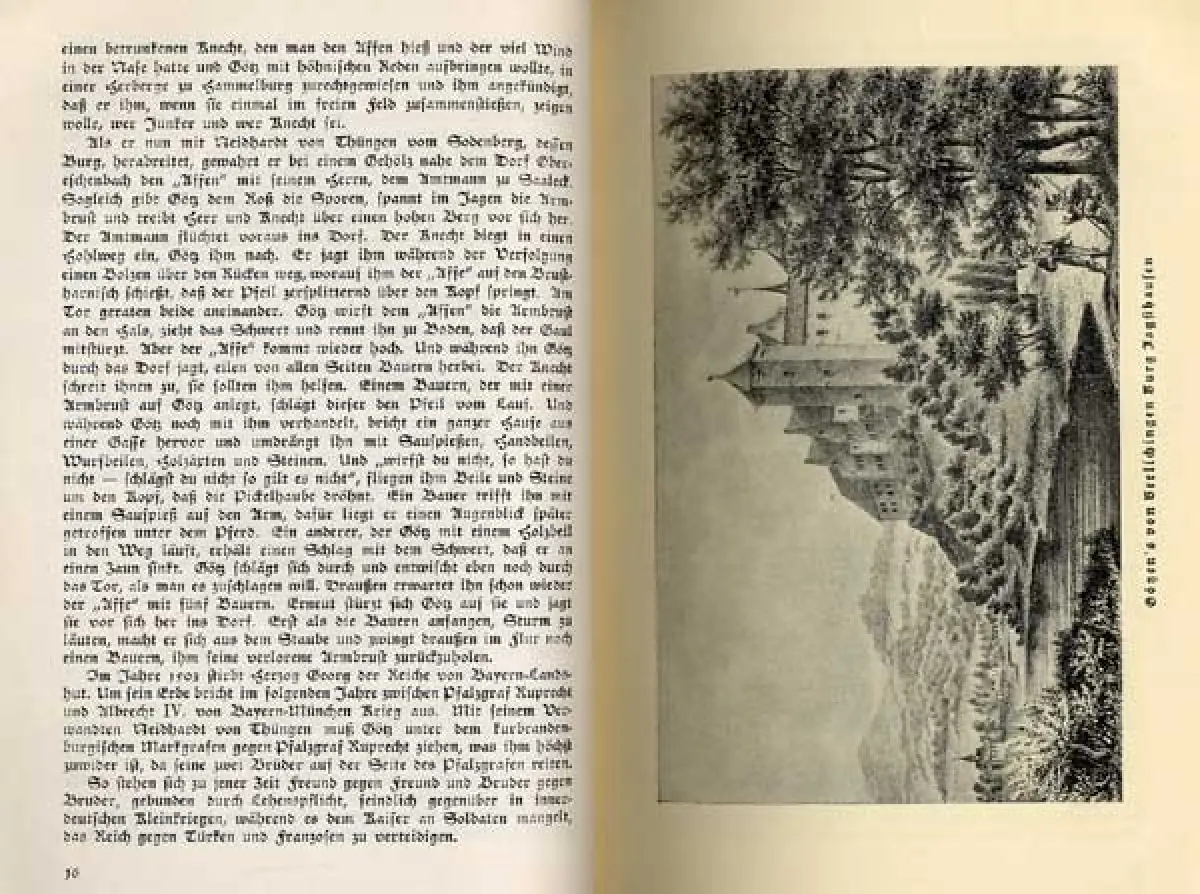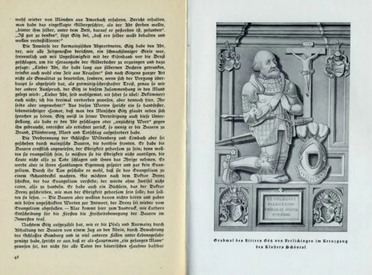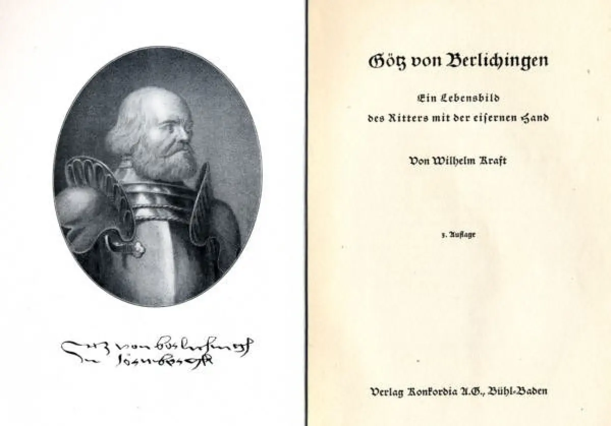 BRANDENBURG PREUSSEN POLITIK GESCHICHTE DER GROSSE KURFÜRST Götz von Berlichingen - ein Lebensbild des Ritters mit der Eisernen Hand regionalhistorische Buchausgabe von 1937 zum Buch gibt es außerdem noch 5 alte Postkarten mit GESAMT 50 Seiten druckgraphischen Abbildungen Stammbaum und Familiengeschichte der Ritter von Berlichen Deutschland zu Beginn des 16. Jahrhunderts Kindheit und Jugend des Ritters Kämpfe und Fehden Götz von Berlichingen und der deutsche Bauernkrieg sein weiteres Schicksal Tod und Lebensende \nGuter Zustand. Format 21cm x 15cm.\n Die ausgewählten Bild Beispiele haben eine unterschiedliche Auflösung was die Wiedergabe durch den Scan beeinträchtigen kann.