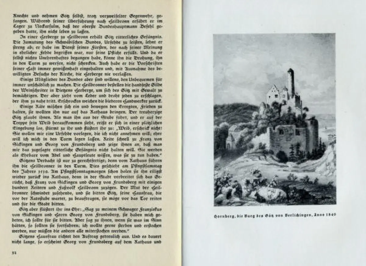 Götz von Berlichingen 1480-1562 schwäbischer Reichsritter Abenteuerer und vielleicht auch schon zu Lebzeiten eine Legende. Berlichingen war zeitlebens in Kämpfe und Fehden von seinen Feinden schon oft gefangen gelang ihm wieder die Flucht eine Befreiung. 1504 verlor er während der Belagerung von Landshut seine rechte Hand und ließ sich diese zum Staunen seiner Zeitgenossen eiserne Prothese ersetzen. Während des Bauernkrieges war Berlichingen kurz der Anführer des Odenwälder Haufens er galt als Freund und Verbündeter des Reichsritters Franz von Sickingen dem Führer des deutschen Kleinadels. Nach dem Ende des Bauernkrieges wurde Götz von Berlichen auf seine Stammburg Hornberg gebannt jedoch nahm noch mit fast 70 Jahren an verschiedenen Kriegszügen von KaiserKaiser Karl teil bevor 1562 mit mehr als 80 Jahren auf seiner Burg Hornberg verstarb.