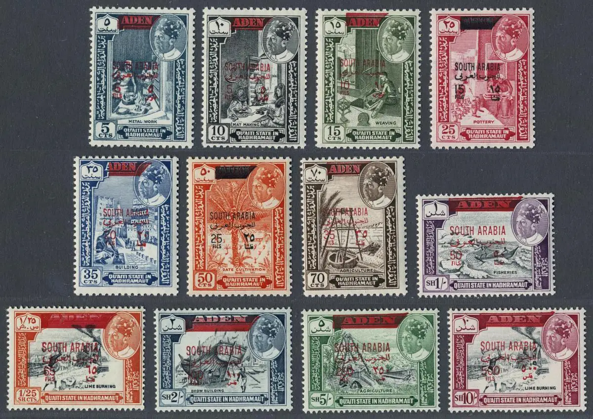 MiNr. 41-52 mit Aufdruck SOUTH ARABIA, auch in Arabisch, Aufdruck neuer Währung und Balken über Aden.