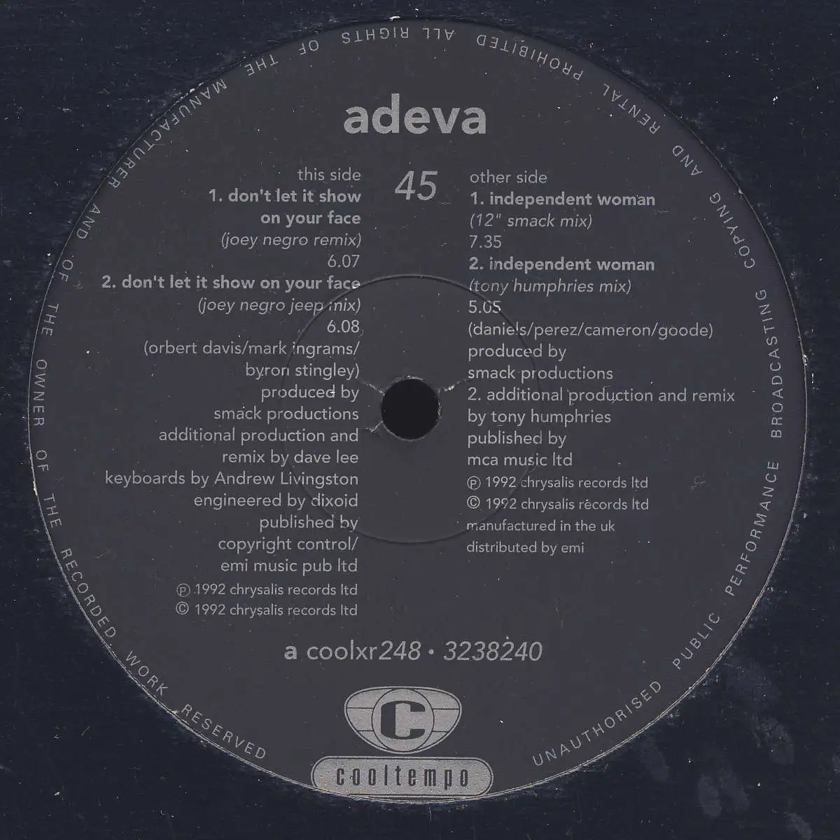 12" Maxi Adeva - Don't Let It Show On Your Face, couverture neutre, état disque VG; Fabriqué en United Kingdom 1992 Cooltempo coolxr248, 3238240, Tracks [Joey Negro Remix] 6:07, [ Joeys Negr Jeep Mix] 06:08, Independent Woman [Smack Mix) 7:35, Indépendent Womann [Tony Humphries Mix ] 5:05