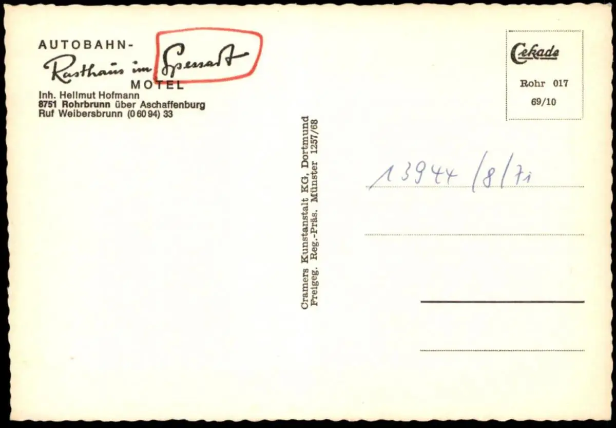 ÄLTERE POSTKARTE AUTOBAHN-RASTHAUS IM SPESSART MOTEL ROHRBRUNN ÜBER ASCHAFFENBURG INHABER HELMUT HOFMANN RASTSTÄTTEVerlag: Cramers, Dortmund