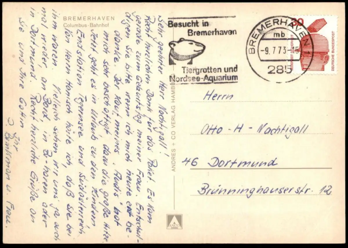 Gelaufen: 09.07.1973 mit Stempel Bremerhaven “Besucht in Bremerhaven Tiergrotten und Nordsee-Aquarium” nach Dortmund