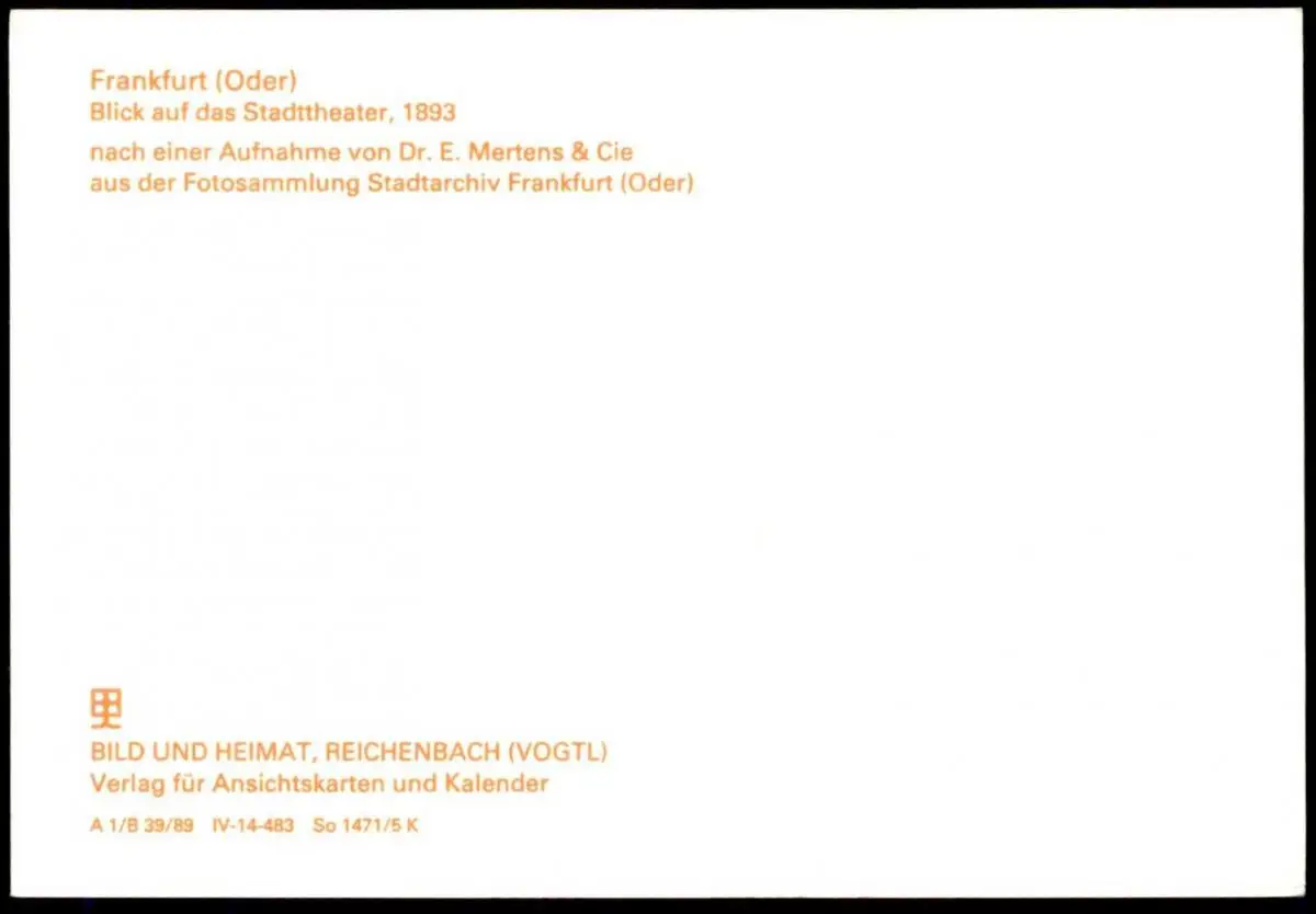 ÄLTERE POSTKARTE FRANKFURT ODER BLICK AUF DAS STADTTHEATER 1893 NACH EINER AUFNAHME VON DR. E. MERTENS & CIE AUS DER FOTOSAMMLUNG STADTARCHIV FRANKFURT (ODER)Verlag: Bild und Heimat, Reichenbach